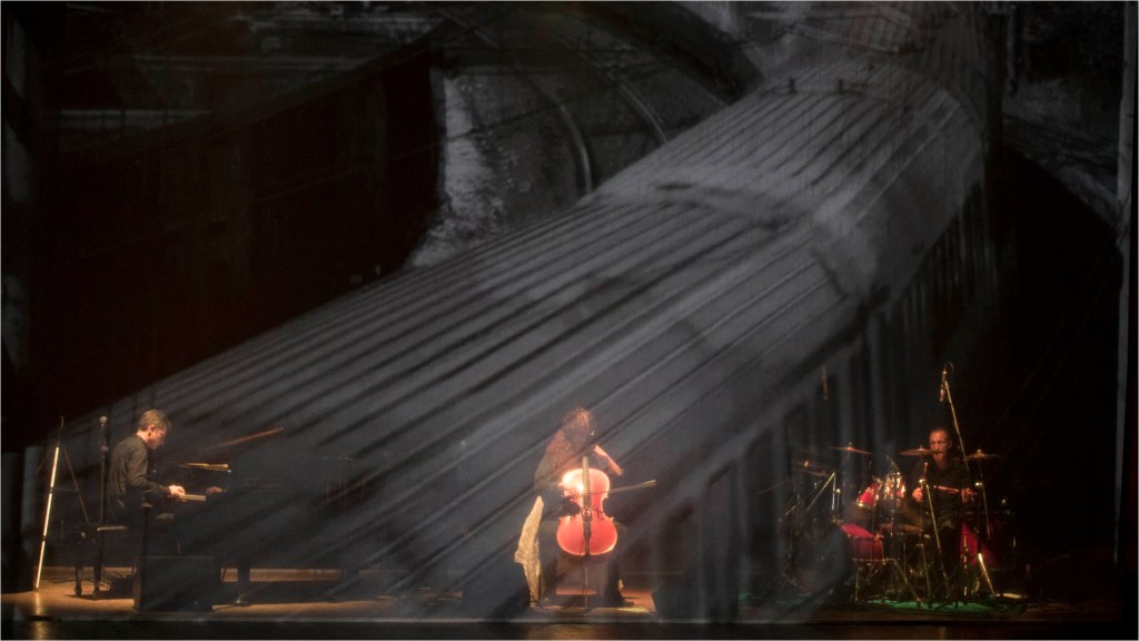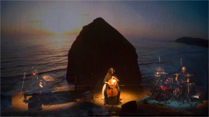 L’ esibizione olographica si basa sull interazione tra la misica dal vivo e l’esperienza cinematografica proiettata di fronte al gruppo. Graziead un velo semi-trasparente di grandi dimensioni, la proiezione crea un esperienza immersiva. Scene aeree, paesaggi evocativi e scene urbane sono state selezionate e montate con cura dal gruppo.