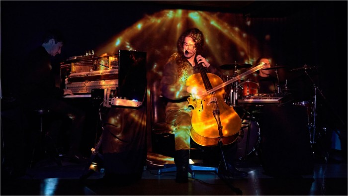 Video-mapping è un installazione creata su misura dello spazio performativo che crea un esperienza immersiva tra lo spazio, la musica, i musicisti e le immagini in movimento.